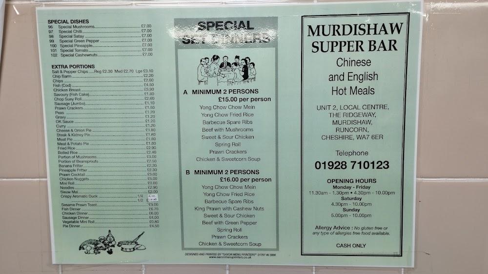 Murdishaw Supper Bar sits on The Ridgeway in Murdishaw, a charming area in Runcorn, UK. This eatery has been a cornerstone of the local community for years, known for its friendly atmosphere and delicious food. The location is conveniently accessible with a wheelchair-friendly parking lot and seating, making it a welcoming spot for all. At this supper bar, diners can experience the hustle and bustle of a typical chippy, where locals gather for their favorite takeaway options. With the recent change of ownership, the Supper Bar has revitalized its menu and service, creating buzz among residents who appreciate the return of quality food. Open seven days a week, it invites visitors to indulge in a diverse selection of dishes designed to satisfy any craving at any time of the day.